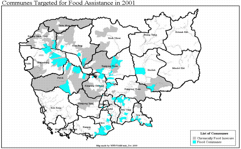 Étant donné l'étendue des dommages cumulés subis par les cultures de riz cette année et leurs conséquences possibles sur les disponibilités vivrières et sur la sécurité alimentaire des ménages l'an prochain, le gouvernement cambodgien a demandé qu'une Mission conjointe FAO/PAM d'évaluation des récoltes et des approvisionnements alimentaires soit dépêchée sur le terrain du 6 au 15 décembre afin d'évaluer la situation alimentaire générale et le besoin éventuel d'une aide dans ce domaine pour l'année 2001 (de janvier à décembre). Les conclusions de la mission sont fondées sur les entretiens que ses membres ont eus avec des organismes gouvernementaux, des institutions des Nations Unies, des ONG, des négociants et des agriculteurs ainsi que sur les visites qu'ils ont effectuées dans les principales régions rizicoles: Battambang, Kapong Cham, Prey Veng et Takeo.