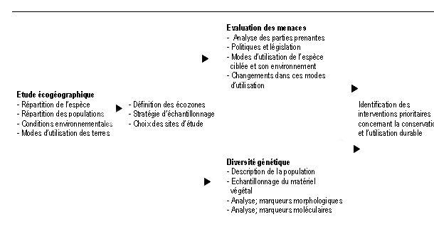 Afin d'élaborer des stratégies pour la conservation et l'utilisation des ressources génétiques forestières (y compris des méthodes de conservation in situ, des techniques de conservation ex situ ou une combinaison appropriée des deux), il faut disposer d'informations spécifiques sur les espèces cibles et leur environnement. Les participants ont évalué la disponibilité d'informations utiles pour la conservation des ressources génétiques de chaque espèce prioritaire. Ils ont pu constater que pour la plupart des espèces, les informations pertinentes font totalement défaut ou sont insuffisantes, notamment 1) sur la distribution et les caractéristiques de l'espèce et de sa population, 2) sur les utilisations de l'espèce, les menaces pesant sur elle et sur sa valeur socio-économique, et 3) sur les types de diversité génétique de l'espèce et les processus influant sur ceux-ci. Cette pénurie d'informations a abouti à des propositions concernant les activités de recherche. Les participants ont reconnu à l'unanimité qu'il fallait donner la priorité aux activités qui mériteraient qu'on élabore des stratégies à l'appui de la conservation et de l'utilisation des ressources génétiques forestières. A ce stade, un programme de recherche pour des espèces prioritaires a été proposé. Il est axé sur trois différents domaines d'étude, à savoir: a) études écogéographiques, b) utilisation de l'espèce et évaluation des menaces et c) études de la diversité génétique (figure 2). Ce programme de recherche faciliterait l'établissement de liens entre les diverses activités de recherche, permettrait d'assurer un suivi permanent des activités et renforcerait le flux continu d'informations. Les participants sont convenus que pour cibler leurs efforts, les activités liées à la conservation et à l'utilisation des ressources génétiques forestières devront à l'avenir s'inscrire dans ce programme. Ils ont également reconnu que le programme faciliterait l'établissement de liens entre les différentes disciplines de recherche (écologie forestière, socio-économie et phytogénétique), renforçant ainsi une approche multidisciplinaire.