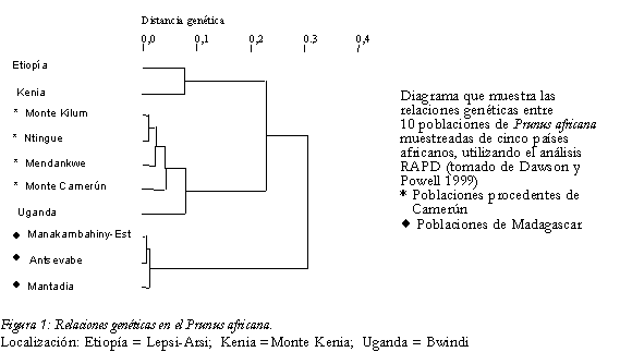 El P. africana tiene una extensa distribución aunque disgregada en "islas" de bosques de montaña de toda África (Kalkman 1965), cabiendo esperar que la variación genética se haya diferenciado consecuentemente. Los análisis realizados por Dawson y Powell (1999) utilizando marcadores moleculares (ADN Polimórfico Ampliado al Azar, RAPD) indican que éste es, en efecto, el caso a nivel genético. Analizando 10 poblaciones muestreadas de Camerún, Etiopía, Kenia, Madagascar y Uganda, los datos revelaron una gran variación genética entre países (66%, P < 0,001), lo que indica la importancia de los métodos regionales de conservación. La variación entre individuos, dentro de las poblaciones y entre poblaciones, en Camerún y Madagascar, resultó también muy significativa, lo que indica la importancia de desarrollar estrategias de ordenación genética que tengan en cuenta también la variación genética dentro de los países. A pesar de la distancia geográfica entre Uganda y Camerún, el material de Uganda era más similar a las poblaciones de África occidental que al material de Kenia y Etiopía (Figura 1). Esto está de acuerdo con las teorías de White (1983) referentes a las diferencias climáticas de carácter histórico y a los corredores de migración durante los períodos glaciales. Los datos indican que las poblaciones malgaches eran muy distintas y, por lo tanto, de especial interés su conservación.