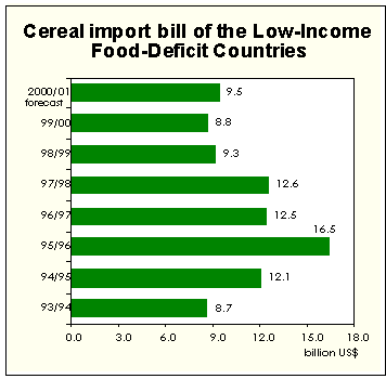 than in the previous year. The reduction in this month's forecast reflects a cut in the forecast for imports by China, which more than offset the combined effect of increased forecasts for the Islamic Republic of Iran, the Republic of Korea and the EC. While reduced production is expected to be responsible for larger wheat import demand in several countries, overall trade is likely to remain below the previous year's volume mostly because of exceptionally large harvests in a few but important net-importing countries. For the developing countries as a group, imports are forecast at around 81 million tonnes, some 1.3 million tonnes smaller than last year's record. However, given the anticipated rise in export prices, the wheat import cost for the developing countries is forecast to rise by 14 percent to around US$12 billion. For the LIFDCs, wheat imports are put at around 38 million tonnes, down 2.7 million tonnes, or 7 percent, from the previous season. However, because of expected higher prices, the latest forecast puts total value of wheat imports by the LIFDCs in 2000/01 at US$5.3 billion, an increase of 8 percent from 1999/2000.