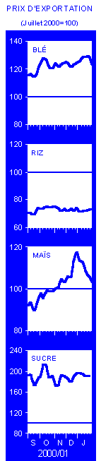 Selon des estimations provisoires, la production céréalière mondiale de l'an 2000 s'établirait à 1 852 millions de tonnes, soit une légère augmentation par rapport aux prévisions de novembre. Les prévisions concernant les utilisations céréalières mondiales ont été ajustées à la hausse et s'établissent désormais à 1 909 millions de tonnes. Le déficit de production devra être comblé à l'aide d'un important prélèvement sur les stocks céréaliers mondiaux. Les estimations des stocks céréaliers de la Chine (continentale) ont été fortement révisées à la hausse pour toutes les années à partir de 1980, ce qui donne, pour les stocks mondiaux, des chiffres sensiblement plus élevés que ceux qui avaient été signalés auparavant. Toutefois, ces révisions, même si elles sont importantes en chiffres absolus, ne représentent que des ajustements statistiques des séries historiques concernant l'offre et la demande en Chine et n'ont donc qu'un impact négligeable, voire nul, sur les conditions fondamentales du marché (voir encadré page 21). Si l'on en croît les dernières informations, plus de 60 millions de personnes connaîtraient des crises alimentaires dans le monde en raison de catastrophes naturelles ou causées par l'homme (voir encadré de la page 5). Selon les prévisions actuelles, les échanges mondiaux de céréales en 2000/01 (juillet/juin) s'établiraient à 236 millions de tonnes, soit 2 millions de tonnes de moins que ce qui avait été signalé en novembre, mais un peu plus que le volume de la campagne précédente. L'augmentation serait due, pour l'essentiel, à une plus forte demande d'importation pour les céréales secondaires. Les cours internationaux du blé et des céréales secondaires se sont légèrement raffermis depuis novembre, mais les prix du riz sont en général faibles. Les vastes disponibilités dans les pays exportateurs continuent de peser sur les marchés des céréales. Les prix des graines et produits d'oléagineux devraient continuer à évoluer dans des sens opposés en 2000/01. Les vastes disponibilités prévues de matières grasses par rapport à la demande devraient probablement limiter les possibilités d'un raffermissement soutenu des prix des matières grasses, mais pour les graines oléagineuses, ainsi que les farines et tourteaux d'oléagineux, le rapport entre l'offre et la demande sera plus tendu, ce qui pourrait se traduire par un nouveau raffermissement des prix. Le commerce des produits oléagineux devrait continuer à se développer, mais à un rythme moindre qu'au cours des deux campagnes précédentes. La croissance de la production mondiale de viande s'est ralentie en l'an 2000, essentiellement du fait d'une baisse de la production dans les pays développés. Les échanges mondiaux de viande ont progressé de moins de 2 pour cent en raison des bouleversements commerciaux causés par l'apparition de maladies animales dans les principaux pays exportateurs. En 2001, les échanges internationaux devraient se développer mais ils seront probablement influencés par les préoccupations continues concernant l'ESB, facteur qui pourrait également peser sur les prix du boeuf en 2001. |
