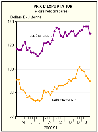 Dans l'ensemble, au cours de la première moitié de la campagne de commercialisation 2000/01 (juillet-décembre), les prix internationaux du blé ont augmenté, traduisant la forte demande d'importations commerciales et la prévision d'une baisse des stocks de report des principaux pays exportateurs. La hausse des prix du blé s'est ralentie à l'approche de la période des fêtes, fin décembre, du fait d'une diminution des achats et d'une pression à la baisse résultant de la campagne agricole principale de l'hémisphère Sud. En janvier, le blé No. 2 des États-Unis (blé roux vitreux d'hiver, f.o.b) a atteint, en moyenne, 134 dollars E.-U la tonne, soit environ 3 dollars E.-U. la tonne de plus qu'en octobre 2000 et presque autant que 23 dollars E.-U. la tonne, soit 17 pour cent, par rapport à l'année précédente. En Argentine, la nouvelle récolte de blé s'est établie, en moyenne, à 120 dollars E.-U. la tonne en janvier, soit 3 dollars E.-U. la tonne de moins que les valeurs de la période précédant Noël, mais 27 dollars E.-U. la tonne, soit 23 pour cent, de plus qu'à la même période l'an dernier. Bien que l'on prévoie une légère expansion du volume des échanges commerciaux durant la campagne en cours, la compétition que se livrent les principaux exporteurs pour obtenir une part de marché, associée à l'abondance des disponibilités exportables, même parmi certains exportateurs non traditionnels, pourrait limiter une forte hausse des prix internationaux du blé dans les mois à venir.