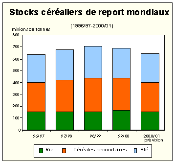 Si l'on tient compte des chiffres révisés pour la Chine, les stocks mondiaux de céréales, à la clôture des campagnes qui s'achèveront en 2001, devraient avoisiner les 640 millions de tonnes, soit 52 millions de tonnes, ou 7 pour cent, de moins que leurs niveaux d'ouverture et le plus faible volume enregistré en quatre ans. Les prélèvements que l'on prévoit durant la campagne en cours traduisent un fléchissement de la production céréalière en 2000, mais aussi une plus forte utilisation en 2000/01.