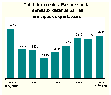 Le volume des stocks détenus par les principaux pays exportateurs devrait se maintenir au niveau de l'an dernier, soit autour de 77 millions de tonnes, du fait essentiellement de la croissance des stocks aux États-Unis résultant d'une production de maïs record en 2000. À l'exception du Canada, où l'on prévoit également une réduction des stocks de maïs, tous les autres grands exportateurs devraient clôturer la campagne avec des niveaux de stocks similaires à ceux de l'année précédente.