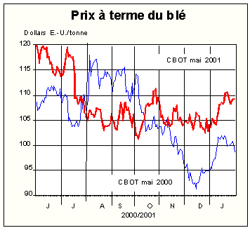 En ce qui concerne le marché à terme, la pression exercée par les disponibilités a continué de peser sur les cours. Le prix du blé à terme à brève échéance a achevé la fin de la troisième semaine de janvier par un léger fléchissement par rapport au mois précédent. Au cours des dernières semaines, le marché à terme du blé tendre rouge d'hiver en mai coté au Chicago Board of Trade (CBOT) a baissé, bien qu'il ait été en général plus élevé qu'à la même époque l'an dernier. Compte tenu des présentes indications, il est difficile d'envisager une forte reprise des prix avant au moins une autre campagne.