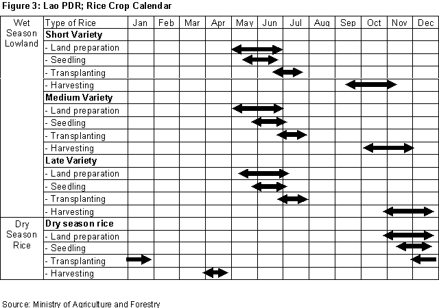 Most farmers in Lao PDR are engaged in subsistence rice farming. The most important producing areas in the country are located in the central region and include the provinces of Savannakhet, Vientiane Municipality and province, Khammouane and Borikhamxay. There are three predominant systems of rice production, wet season lowland; wet season upland and dry season. During the wet season various varieties of rice are cultivated, though the proportion of high yielding varieties has increased phenomenally. It is estimated that in 1990 high yielding varieties only accounted for 5 percent of wet land area; currently it is around 60-70 percent. Irrigated dry season cropping is entirely under high yielding varieties. The crop sequence of various types of rice varieties is indicated in Figure 3.