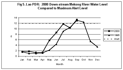 In 2000, the Mekong River reached it's highest level in August/September when it was above danger level, down stream, for a short period. Figure 5 indicates down-stream water levels in the Mekong in 2000, compared to 1996, the last severe flood year and the level of alert.
