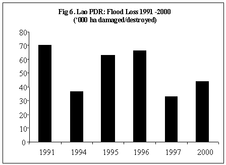 Relative to flood losses in other countries, especially in Cambodia and Vietnam, and to the devastating floods in Lao PDR in 1991 and 1996, the extent of damage to agriculture in 2000 was lower (see Figure 6).