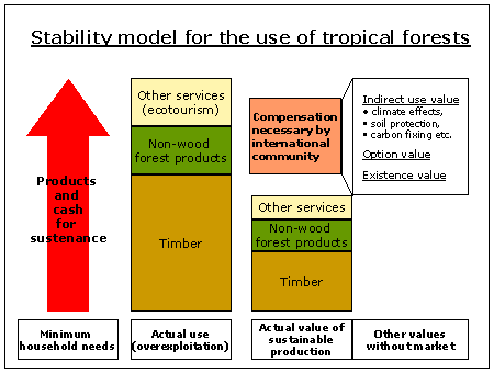 After de-colonisation in many tropical countries the European paradigm of forest management practice was kept. In some countries, like India, even more power was given to the state administration. Tropical forest resources were seen as a capital stock which could be liquidated rapidly (stage 3). This thinking was supported by western forest politicians, which argued that economic development requires mainly capital to proceed from the stage of the traditional society to the take off (ROSTOW 1960). ZIVNUSKA (1966) argued that under the conditions of initial growth and transition towards industrialisation the concept of sustainability is not applicable for tropical forest management. Only by massive forest use, respective capital investment in timber industries and later reinvestment in plantations would permit a rapid growth of the national economy. Many countries followed this way and mainly failed because of the lack of adequate organisational structures, political will and corruption (see PRETZSCH 1987).