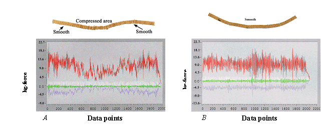 Figure 3. Typical cutting forces for dry normal (A) and tension (B) wood of red maple. Lines on the blocks of wood (upper) show cutting locations. Principal force in A is more or less uniform, (15 to 20 kg-force, average 17.46). In B the principal force is uniform (average 16.10 kg-force) but then at the end of the first third of the graph it is dramatically lower (see arrow) at 10.5 to 13.6 kg-force, corresponding with wider growth increments of tension wood (stained blue in the microtome section just above the graph).