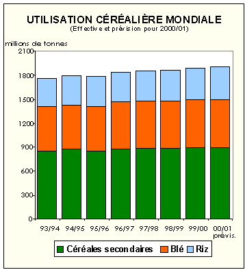 Après une croissance relativement soutenue de 2 pour cent en 1999-2000, la consommation totale de céréales pourrait se stabiliser en 2000-2001 à 1,907 million de tonnes, au-dessus de la moyenne des trois années précédentes. Le volume des céréales destiné à la consommation alimentaire devrait s'accroître de 1,1 pour cent, essentiellement parmi les pays en développement en Asie et les pays de la CEI. Cette hausse ne devrait cependant pas être suffisante pour élever la consommation moyenne de céréales par habitant tant au niveau mondial que dans l'ensemble des pays en développement. Par ailleurs, l'alimentation animale ne devrait pas trop souffrir, à court terme, des préoccupations dues à la transmission par les farines animales de la maladie de l'encéphalopathie spongiforme bovine et plus récemment è l'épidémie de fièvre aphteuse.