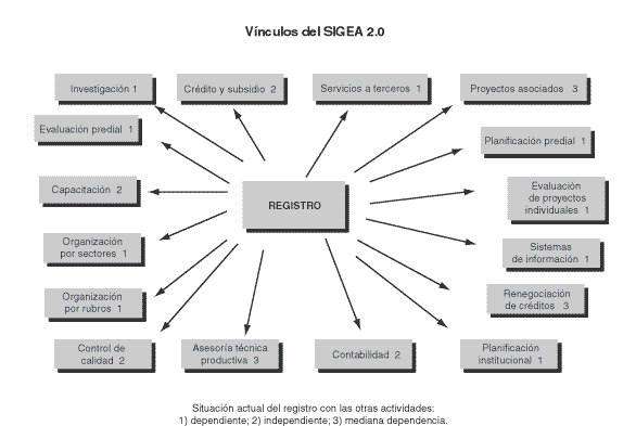 El Departamento de Informática del Centro de gestión, tiene como función la recepción, procesamiento y distribución de la información requerida por el Centro y sus asociados, además de haber generado y tener que actualizar permanentemente un «Sistema Informático de gestión empresarial agrícola» (SIGEA). El desarrollo del SIGEA fue necesario para procesar en forma más rápida y precisa los antecedentes de los usuarios para respaldar mejor las recomendaciones y decisiones. Este paquete computacional ayuda a aclarar el origen de los principales costos, interpretar los gastos generales, explicar los cambios en los costos de producción, ayudar a determinar los precios mínimos que hacen rentable el negocio, ayudar a asignar los recursos productivos, etc. Sus vínculos y funciones se muestran en la Figura 3.