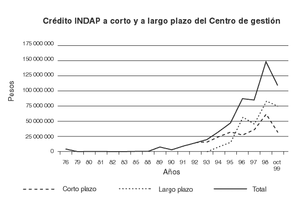 Respecto a la situación crediticia de los socios del Centro de gestión, para la serie de temporadas agrícolas evidenciadas en el gráfico siguiente, se observa que a partir del año 1993, aumentan los créditos obtenidos. Es notorio el incremento de éste a partir del año 1996, explicado principalmente por el mayor apoyo que han tenido los agricultores por parte del equipo técnico del proyecto, presentándose un importante crecimiento de los créditos a largo plazo. Lo anterior denota la intervención del Centro de gestión a través de la formulación de proyectos que poseen un componente importante de inversión productiva.