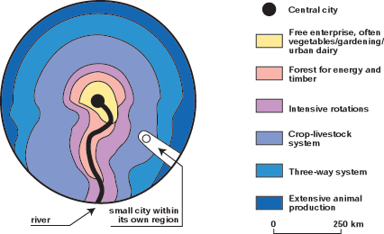 Many modern urban livestock systems occur in tropical regions, but their existence has been described for a long time, for example by the agricultural economist Von Thünen, who researched German conditions some 150 years ago. In his "location theory" he showed how intensive livestock systems tend to occur right in and around urban centres, together with other intensive forms of agriculture such as vegetable production (Nou, 1967). The production of forests for energy and timber took place at a somewhat greater distance from the towns, followed by cropping and more extensive forms of agriculture and, ultimately, by extensive livestock production. Obviously, the location theory should not be taken too literally; fossil fuel has replaced timber and the general pattern may be disturbed by rivers, roads, mountain-ridges, etc. Still, the basic outline of Von Thünen's theory should be kept in mind when discussing the emergence of urban livestock systems in any part of the world (Figure 3 and Photo 15).