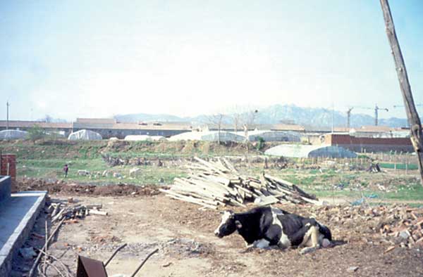 A typical case of Von Thüren's location theory in a Chinese city of today: in the foreground, a dairy cow of a commercial farm; slightly to the left behind the cow on the riverbank, a "subsistence" herder with goats; in the distance, greenhouses and open air vegetable farms against the backdrop of a growing city. The diary farmers supply dung to the greenhouse owners to fuel biogas pits.