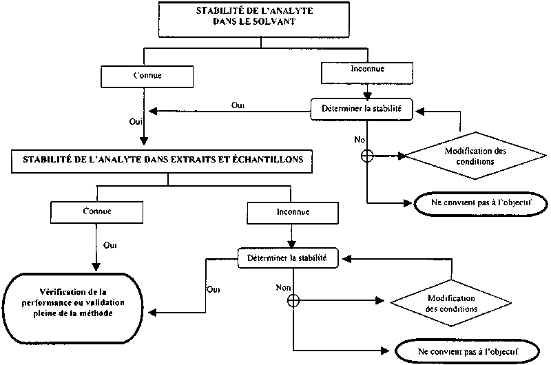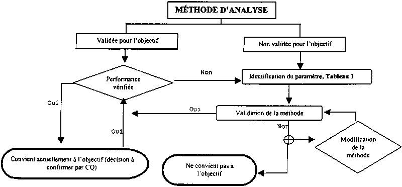 (a) Les analytes représentatifs sélectionnés devraient:4.4.3 Lorsque des données appropriées sont déjà disponibles, il n'est pas nécessaire que l'analyste effectue tous les essais. Néanmoins, toutes les informations requises doivent être incluses ou mentionnées dans les registres de validation. Le tableau 1 donne une vue d'ensemble des paramètres à évaluer pour la validation d'une méthode selon le statut de la méthode à valider. Des paramètres et critères spécifiques à évaluer sont énumérés au tableau 2. On évaluera uniquement les paramètres convenant à la fois à la méthode et à l'objectif pour lequel la méthode particulière doit être appliquée. Dans de nombreux cas, les caractéristiques de performance par rapport à plusieurs paramètres peuvent être obtenues simultanément en utilisant une seule expérience. Les plans d'expérience où différents facteurs sont modifiés en même temps (plans expérimentaux factoriels), peuvent aider à réduire au minimum les ressources nécessaires. Les performances de la méthode d'analyse devraient être vérifiées, d'abord durant son élaboration, et ensuite durant son utilisation, comme il est indiqué à la section 4.5, selon les critères mentionnés au tableau 3.(i) Posséder une gamme suffisamment large de propriétés physico-chimiques pour inclure celles des analytes représentés;(b) Dans la mesure du possible, tous les analytes inclus dans le processus de validation initial devraient être ceux qui doivent être testés régulièrement et qui peuvent être déterminés simultanément par le système de dosage utilisé.(ii) Figurer parmi ceux qui ont le plus de chances d'être détectés régulièrement, ou pour lesquels des décisions critiques doivent être prises sur la base des résultats.