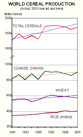 Latest indications continue to point to an increase in global cereal production in 2001. Despite this, a tightening of the overall cereal supply/demand situation is in prospect for the forthcoming 2001/2002 marketing season. Based on the condition of crops already in the ground and assuming normal weather for the remainder of the 2001 cropping seasons, world cereal output this year is forecast at 1 878 million tonnes (including rice in milled terms), 27 million tonnes or 1.3 percent more than output in 2000. However, as growth in cereal usage is anticipated to continue in the coming 2001/02 season, output at this level would be insufficient to meet global utilization for the third year in succession, leading to a further significant reduction in world cereal stocks. Considering that the forthcoming season is set to begin with opening stocks at their lowest level since 1997, another sharp decrease by the end of the 2001/02 seasons could lead to tighter supply situation in 2002/03, especially in terms of exportable supplies as stocks are also likely to fall in some of the major exporting countries.