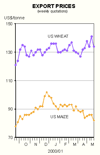 In the maize market, prices remain under pressure. Since last October, when GMO maize (StarLink) was first noted in shipments from the United States, U.S. maize prices have remained under pressure but also volatile, with Japan and the Republic of Korea, at times opting for alternative supply sources. In May, the U.S. maize export prices (U.S. No.2 Yellow, fob) fell to US$84 per tonne, down US$8 per tonne since March and US$11 per tonne lower than in the previous year. Although the initial production estimates in the United States point to a decline in 2001, last year's output was a record and inventories in the United States are very high. Furthermore, China is heading for a strong production recovery this year so that exportable supplies in China are also seen to remain high during the next season. By late May, the September maize futures contracts at the CBOT fell to US$78 per tonne, down by as much as US$20 per tonne from the corresponding period last year. Against the background of abundant supplies and current indications of a likely sharp downturn in world import demand, maize prices are more likely to remain depressed than to recover during the next season.