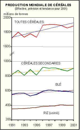 Les récentes indications continuent de faire état d'une récolte céréalière plus abondante en 2001. On prévoit cependant une dégradation de la situation mondiale de l'offre et de la demande au cours de la prochaine campagne de commercialisation 2001/2002. Sur la base de l'état des cultures déjà en terre et dans l'hypothèse de conditions météorologiques normales jusqu'à la fin des campagnes agricoles de 2001, les prévisions indiquent pour cette année une production mondiale de céréales de 1 878 millions de tonnes (riz usiné compris), soit 27 millions de tonnes ou 1,3 pour cent de plus que la production de 2000. Toutefois, étant donné que l'utilisation de céréales devrait continuer de croître au cours de la prochaine campagne 2001/02, ce volume ne permettra pas de couvrir les besoins d'utilisation mondiaux, et ce pour la troisième année consécutive, ce qui donnera lieu à une nouvelle diminution sensible des réserves céréalières mondiales. Considérant qu'au début de la prochaine campagne, les stocks d'ouverture seront à leur niveau le plus bas depuis 1997, un nouveau fléchissement important des réserves d'ici la fin des campagnes 2001/02 pourrait détériorer ultérieurement la situation de l'offre en 2002/03, notamment en termes de disponibilités à l'exportation car une diminution des stocks est également probable dans certains des principaux pays exportateurs.