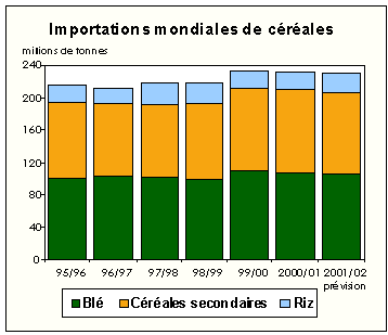 Aux niveaux actuels des prévisions, les importations totales de céréales par les pays en développement en 2000/2001 devrait approcher le volume de la campagne précédente d'environ 170 millions de tonnes. Sur cette base, la facture totale des importations céréalières des pays en développement en 2000/2001 est estimée à l'heure actuelle à environ 22,4 milliards de dollars E.-U., soit 1,2 milliard de dollars E.-U (5 pour cent) de plus que l'an dernier. Ce renchérissement de la facture provient surtout de la hausse des prix du blé en 2000/2001. En ce qui concerne les pays à faible revenu et à déficit vivrier (PFRDV), en tant que catégorie, les importations céréalières devraient se situer à 72 millions de tonnes, soit une baisse de 2 millions de tonnes par rapport à la campagne précédente. Malgré le déclin en volume des importations, le montant total de la facture des importations céréalières des PFRDV devrait augmenter d'au moins 300 millions de dollars E.-U, soit 3 pour cent, pour s'établir à 9,4 milliards de dollars E.-U., ici encore du fait essentiellement de la fermeté des prix du blé.