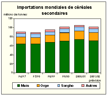 Les prévisions relatives au commerce mondial des céréales secondaires en 2000/2001 (juillet/juin) ont été relevées de près de 2 millions de tonnes depuis avril et se situent à 105,5 millions de tonnes. La présente révision fait suite à la hausse des estimations concernant les importations de la République arabe syrienne, de l'Arabie saoudite et de la Colombie en particulier. Au niveau actuel des prévisions, il se trouve par hasard que le commerce mondial des céréales secondaires et du blé confondus reste inchangé. Les importations mondiales de céréales secondaires ont connu une croissance plus rapide que celles de blé, notamment depuis le milieu des années 90; les premières ayant augmenté de près de 10 millions de tonnes (11 pour cent) et les secondes de 6 millions de tonnes seulement (8 pour cent) depuis 1995/96. Le principal facteur de la croissance du commerce des céréales secondaires a été la hausse de l'utilisation fourragère, qui a été particulièrement favorable au maïs, et l'augmentation rapide de la demande pour le malt qui a fait s'envoler les importations d'orge. En revanche, la demande mondiale pour les autres céréales secondaires importantes, notamment le sorgho, le mil, l'avoine et le seigle est restée à peu près stable ces dernières années.
