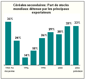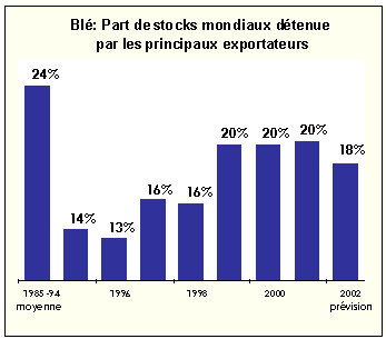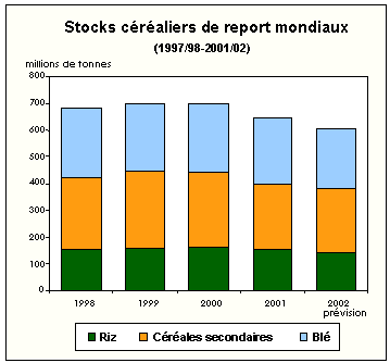 Les perspectives actuelles de production et de consommation pour 2001-2002 et des indications précoces de ce que seront les stocks mondiaux à la fin de la campagne agricole 2001-2002 dans les différents pays laissent prévoir une baisse importante des stocks, de l'ordre de 44 millions de tonnes, soit près de 7 pour cent, qui les ramènerait à 603 millions de tonnes. Considérant que la campagne 2001-2002 doit s'ouvrir avec des stocks sensiblement inférieurs à ceux des trois campagnes précédentes, une nouvelle diminution importante à la fin de la campagne 2001-2002 pourrait se traduire par une offre plus tendue en 2002-2003, surtout en termes de réserves d'exportation, les stocks étant aussi susceptibles de diminuer dans certains des grands pays exportateurs.