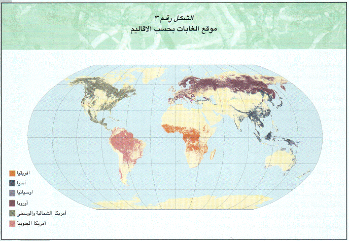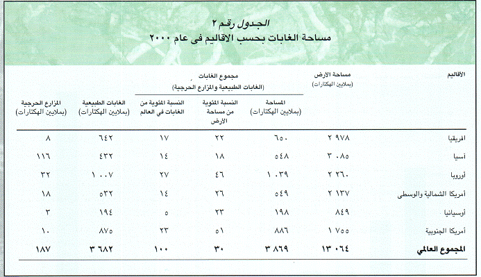 ويتضمن الجدول رقم 2 بيانات التقدير العالمي للموارد الحرجية لعام 2000 عن توزيع الغابات بحسب الاقاليم. ففي أوروبا بما فيها الاتحاد الروسي) وأمريكا الجنوبية توجد أكبر نسبة مئوية من الغابات في العالم (27 و 23 في المائة على التوالي)، وتوجد في أوسيانيا نسبة 5 في المائة. ويتضمن الشكل رقم 3 خريطة توضح موقع الغابات بحسب الاقاليم.