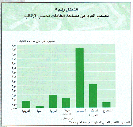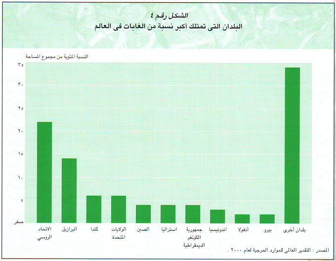 ويوجد ثلثا غابات العالم في عشرة بلدان فقط: الاتحاد الروسي، وا لبرازيل، وكندا، والولايات المتحدة والصين، واستراليا، وجمهورية الكونغو الديموقراطية، واندونيسيا، وأنغولا، وبيرو (الشكل رقم 4. أنظر كذلك الجدول رقم 2 في الملحق الثاني)، ويبلغ متوسط نصيب الفرد من الغابات في العالم 6 ر. هكتار. إلا أنه توجد فوارق واسعة بين البلدان. فنصيب الفرد من الغابات صغير جدآ في آسيا، بينما هو كبير في أوسيانيا وأمريكا الجنوبية (أنظر الشكل رقم ه)، ولا يوجد سوى 22 بلدا فقط يزيد نصيب الفرد فيها عن 3 هكتارات من الغابات، ولا يعيش فيها سوى 5 في المائة تقريبآ من سكان العالم، معظمهم في البرازيل والاتحاد الروسي. ومن جهة اخرى يعيش تلاثة أرباع سكان العالم في بلدان يقل نصيب الفرد فيها عن 0.5 هكتار، من بينها أكثر بلدان العالم ازدحاما بالسكان في آسيا وأوروبا.