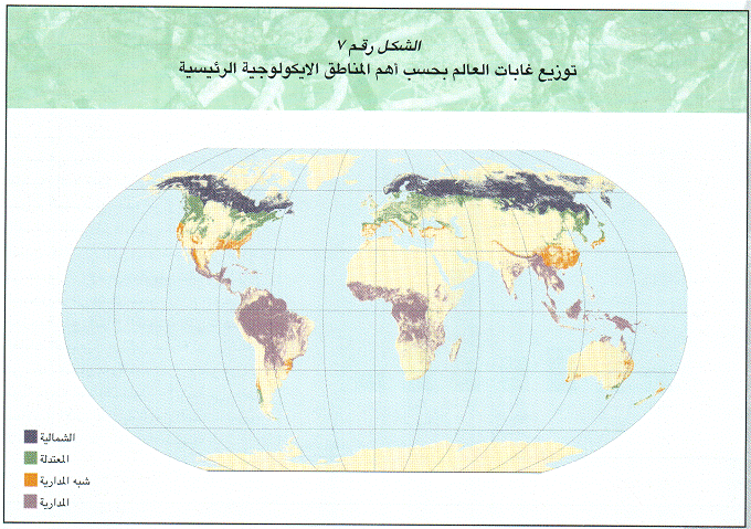 وقد تم تحديد الغطاء الحرجي في العالم بحسب المناطق الإيكولوجية باستخدام خريطة الغطاء الحرجي في العالم الخاصة بتقدير الموارد الحرجية لعام 2000، وخريطة المناطق الإيكولوجية. وتقع النسبة الكبرى من غابات العالم في المناطق المدارية (47 في المائة) تليها المناطق الشمالية (33%)، ثم المناطق المعتدلة (11%)، والمناطق شبه المدارية(9%)، ويبين الشكل رقم 7 موقع الغابات في هذه المناطق الإيكولوجية الواسعة الأربع. ويبين الجدول رقم 3 توزيع الغابات بحسب التصنيفات الاكثر تفصيلا للمناطق الإيكولوجية. فالغابات المدارية وشبه المدارية الجافة تتركز في أفريقيا (التي تحتوي على 36 في المائة من المجموع العالمي)، وفي أمريكا الجنوبية (30 في الماثة)، وفي آسيا (21 في المائة)، ويقع معظم الغابات المدارية المطيرة في أمريكا الجنوبية (58 في المائة)، كما توجد نسبة كبيرة من هذه الغابات (24 في المائة) في افريقيا، ويوجد معطم المتبقي في آسيا (17 في المائة). في حين توجد الغابات المعتدلة والشمالية كلها تقريبآ في أوروبا وأمريكا الشمالية والوسطى، أما الغابات الجبلية فتوجد في أوروبا أساسا (40 في المائة)، وفي أمريكا الشمالية والوسطى (34 في المائة).