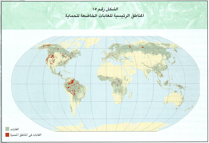 وقد تم التوصل إلى بيانات عالمية متسقة، موزعة بحسب الأقطار، بواسطة تطابق قاعدة البيانات المكانية للمركز العالمي لمتابعة الصيانة، علي خريطة الغطاء الحرجي في العالم المعدة في نطاق التقدير العالمي للموارد الحرجية لعام 2000. وقد بينت النتائج أن 12 في المائة من غابات العالم تندرج في فثات المناطق المحمية حسب تصنيف الاتحاد الدولي لصون الطبيعة، والمتسلسلة من الأولى إلى السادسة. وأن أكبر نسبة من غابات اقليم أمريكا الشمالية والوسطى (20 في المائة) هي من المناطق المحمية، تليها في الترتيب أمريكا الجنوبية (19 في المائة)، وتوجد أدنى نسبة في اقليم أوروبا (5 في المائة). ويعزى السبب في جزء منه، إلى أن تصنيف الاتحاد العالمي لصون الطبيعة (وخاصة الفئتين الخامسة والسادسة) لا يتكيف تماما مع الظروف الأوروبية، ويبين الشكل رقم 15 موقع منطق الغابات الرئيسية المحمية.