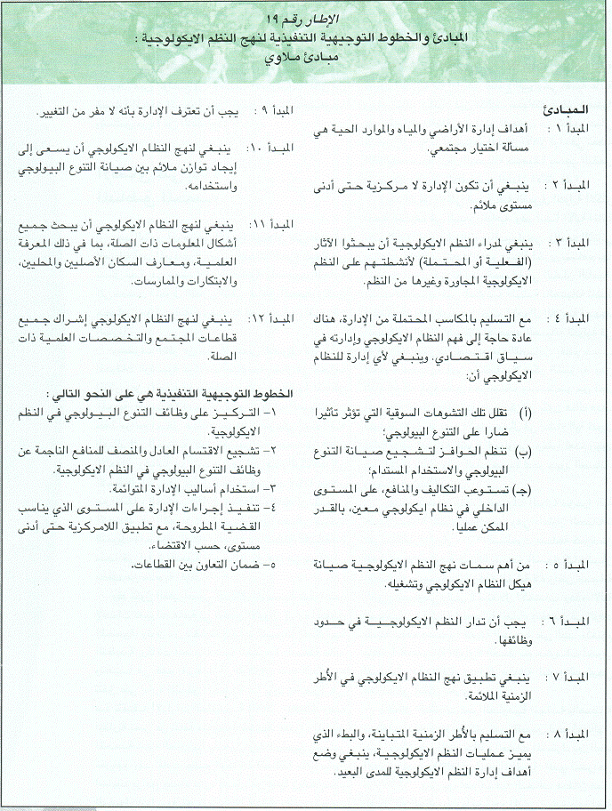 وتستخدم بلدان كثيرة بشكل متزايد نهج النظام الايكولوجي في تخطيط وإدارة استخدام الموارد وتنميتها . وفضلا عن هذا، وافقت الأطراف في الاتفاقية المتعلقة بالتنوع البيولوجي في مؤتمر الأطراف الخامس، الذى عقد في مايو/ أيار 2000، على تطبيق مبادئ نهج النظام الايكولوجي- على النحو الموصوف أعلاه- في إدارة مواردهم الطبيعية. وقد نتج عن مؤتمرين عقدا في إطار الاتفاقية المتعلقة بالتنوع البيولوجي، 12 مبدأ، يشار إليها عادة بمبادئ ملاوي، وخمسة مبادئ توجيهية تنفيذية لاستخدام هذا النهج (أنظر الإطار رقم 19).