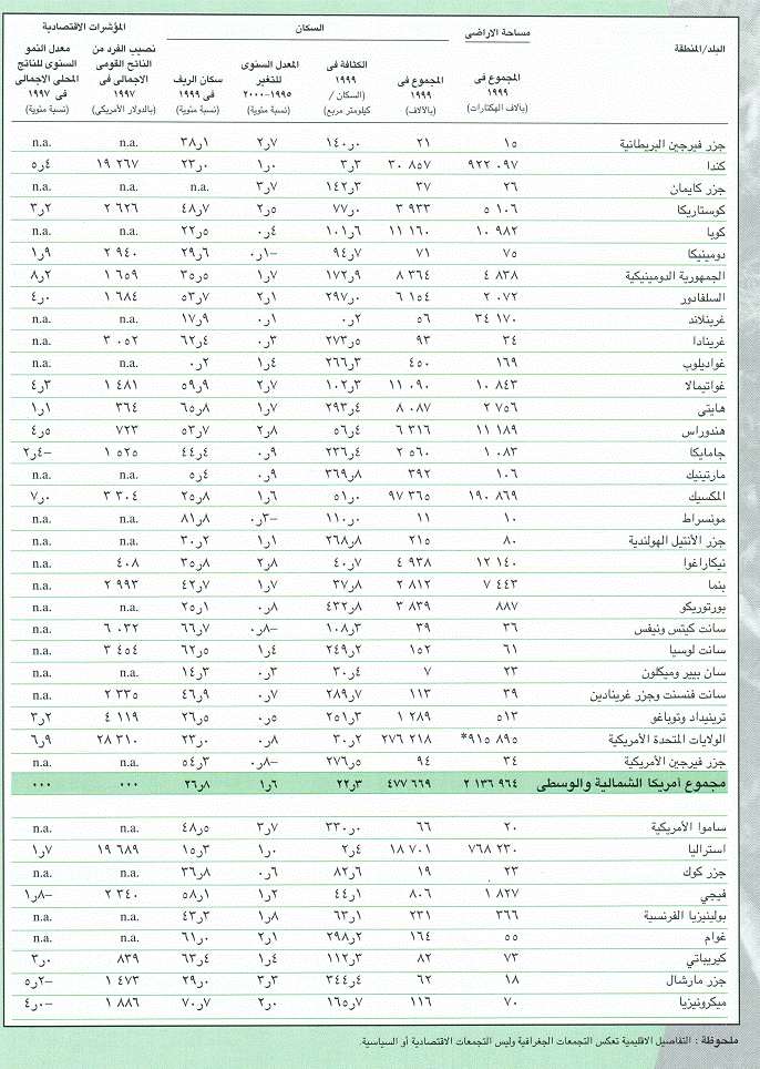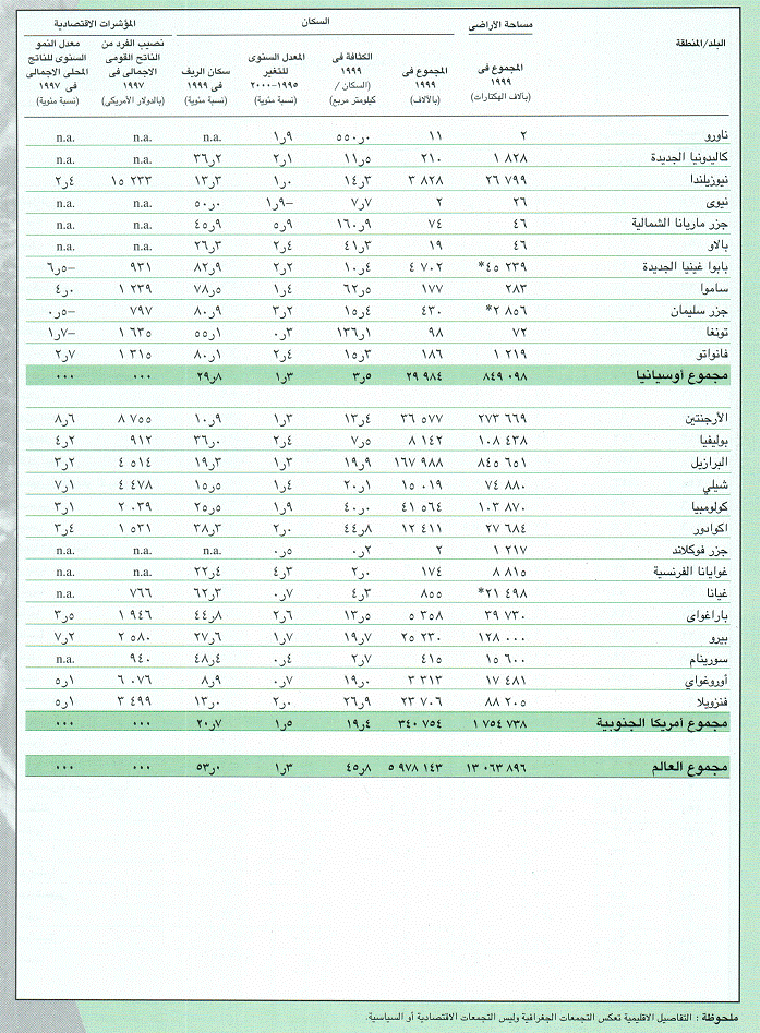 ومصدر البيانات الاقتصادية هو World Development Indicators 1999 (World bank, 2000). وتمثل أرقام الناتج القومي الإجمالي للفرد الناتج القومي الإجمالي مقسما على عدد السكان في منتصف العام، والبيانات مقدرة بالسعر الثابت للدولار الأمريكي في عام 1995 .وتستند النسبة المئوية للنمو السنوي للناتج المحلي الإجمالي إلى السعر الثابت للعملة المحلية.