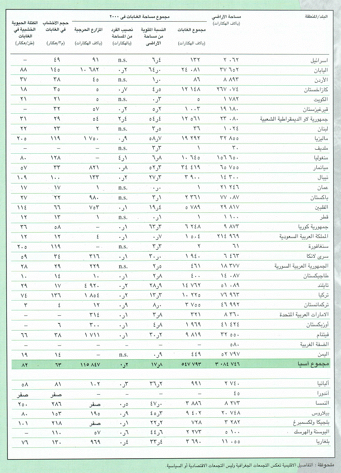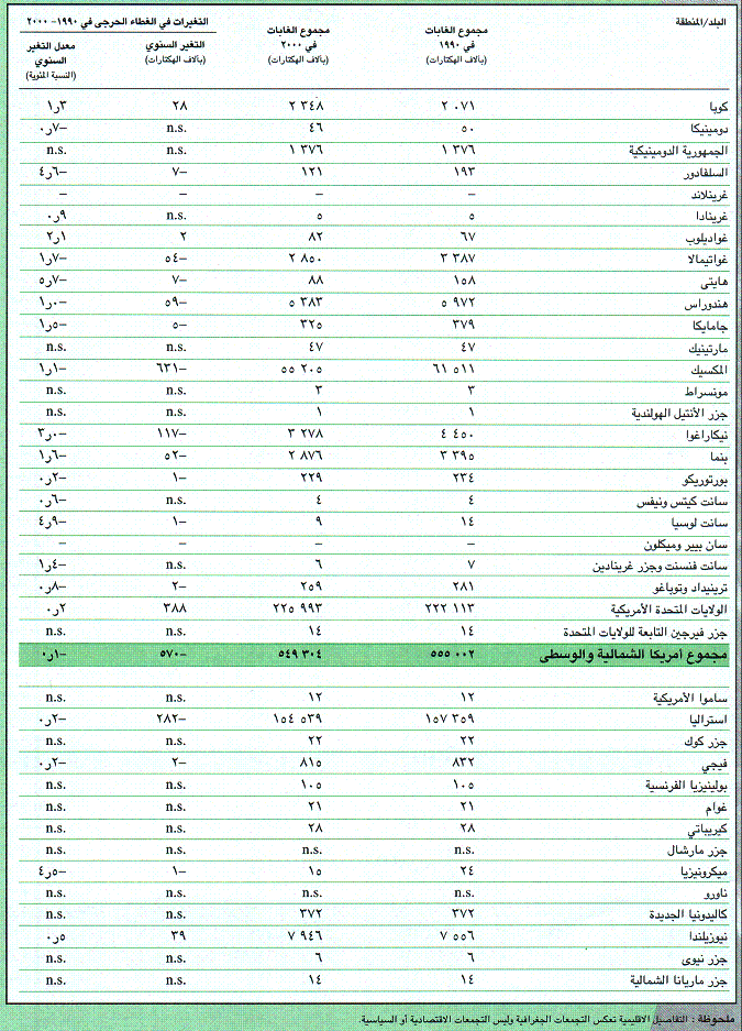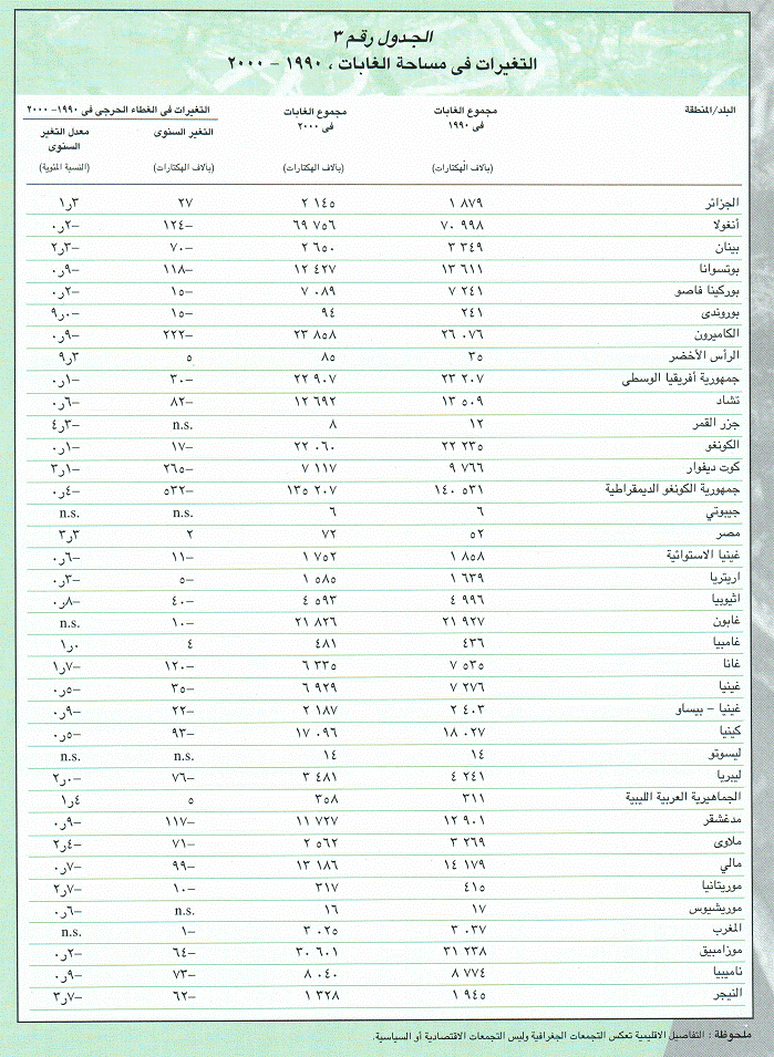 تمثل أرقام عام 2000 أحدث البيانات العالمية المتاحة عن مساحة الغابات والتغيرات التى طرأت عليها، ومصدر هذه البيانات هو مشروع التقدير العالمى للموارد الحرجية لعام 2000 الصادر عن منظمة الأغذية والزراعة. وقد أدخلت المنظمة تعديلات على العامين المرجعيين 1990 و. 2000 ويمثل "مجموع الغابات " مجمل الغابات الطبيعية والمزارع الشجرية الحرجية. والتغيير فى مساحة الغابات هو صافى التغيير الذى يحدث للغابات، ويشمل التوسع فى المزارع الحرجية والنقص أو الزيادة فى مساحة الغابات الطبيعية .