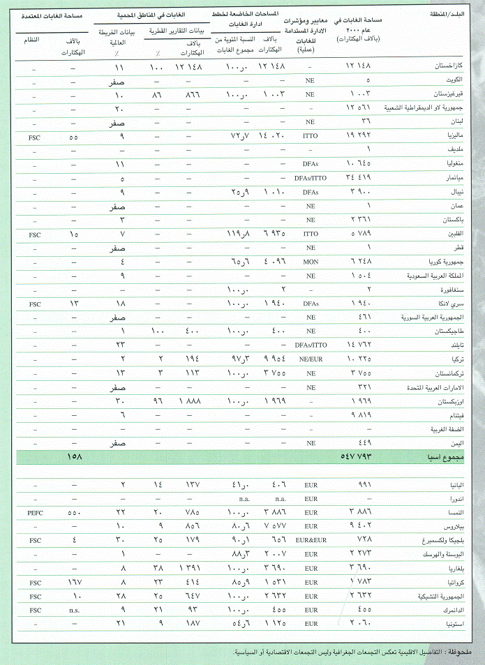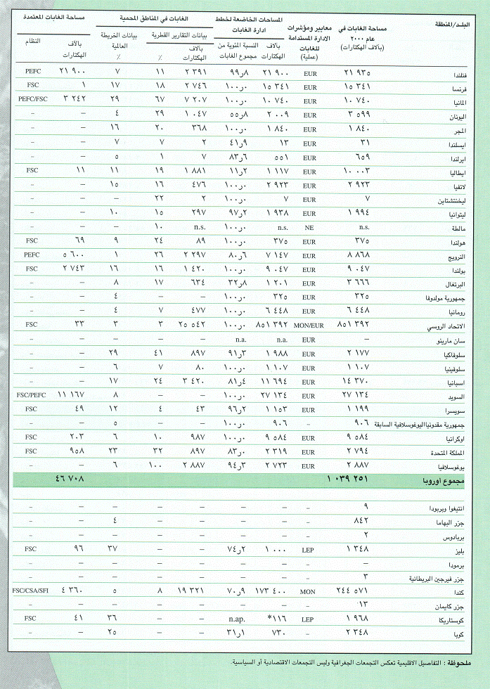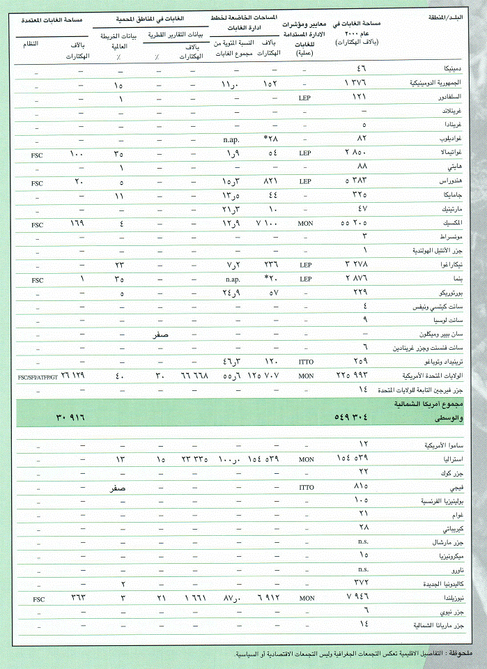 يوجز الجدول المعلومات عن حالة واتجاهات إدارة الغابات حتى نهاية عام 2000، التي تم تجميعها، لاستخدامها في اعداد التقدير العالمي للموارد الحرجية لعام 2000، وهو يتضمن معلومات موزعة بحسب البلدان بشأن العضوية في العمليات الاقليمية الايكولوجية المعنية بمعايير ومؤشرات الإدارة المستدامة للغابات، ومساحة الغابات التي تطبق فيها الخطط الإدارية، ومساحة الغابات التي تتمتع بالحماية القانونية، ومساحة الغابات التي حصلت على شهادات اعتماد المصدر بموجب الخطط والمشروعات المختلفة المختصة بمنحها.