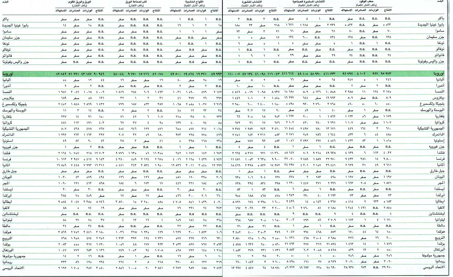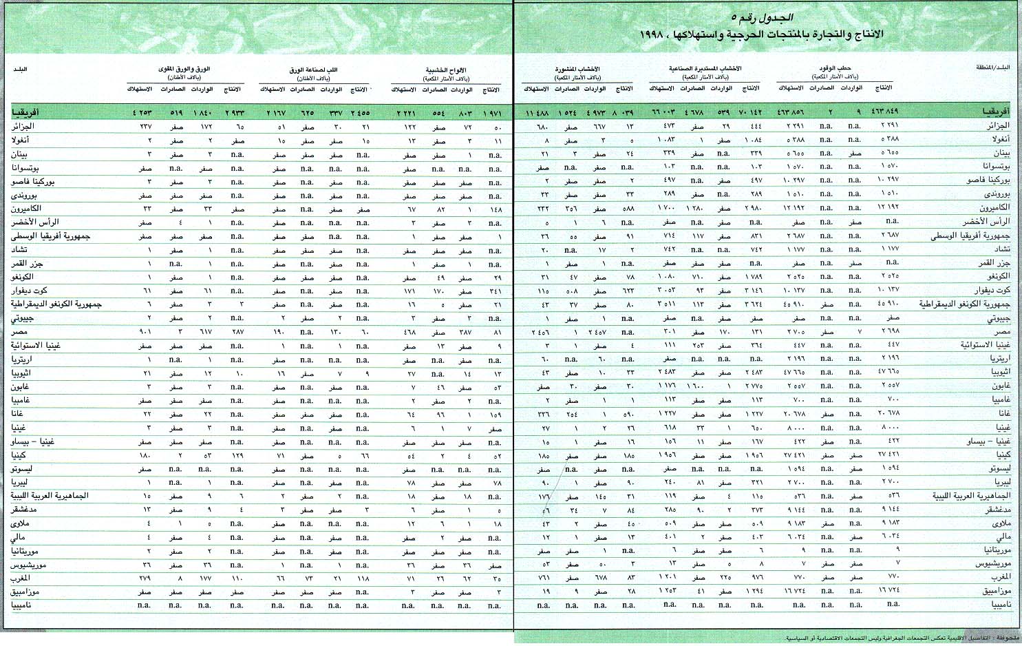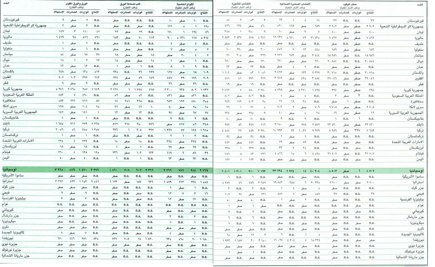 يتضمن الجدول بيانات عن جميع الأقاليم مقسمة إلى بلدان أو مناطق. ومصدر هذه البيانات هو: FAO Yearbook of Forest Products, 1998 (FA0, 2000c) . والمعلومات متاحة أيضا بشكل إلكتروني عن طريق موقع منظمة الأغذية والزراعة على شبكة الإنترنت www.fao.org . ويشير الرقم "صفر" إما إلى صفر حقيقي أو إلى قيمة لا تذكر (أقل من نصف وحدة). وقد تختلف المجاميع الإقليمية عن جملة مجاميع البلدان والمناطق المدرجة في الجدول، ويرجع هذا الاختلاف إما إلى تقريب الأرقام أو إلى أقاليم غير مدرجة في الجداول .