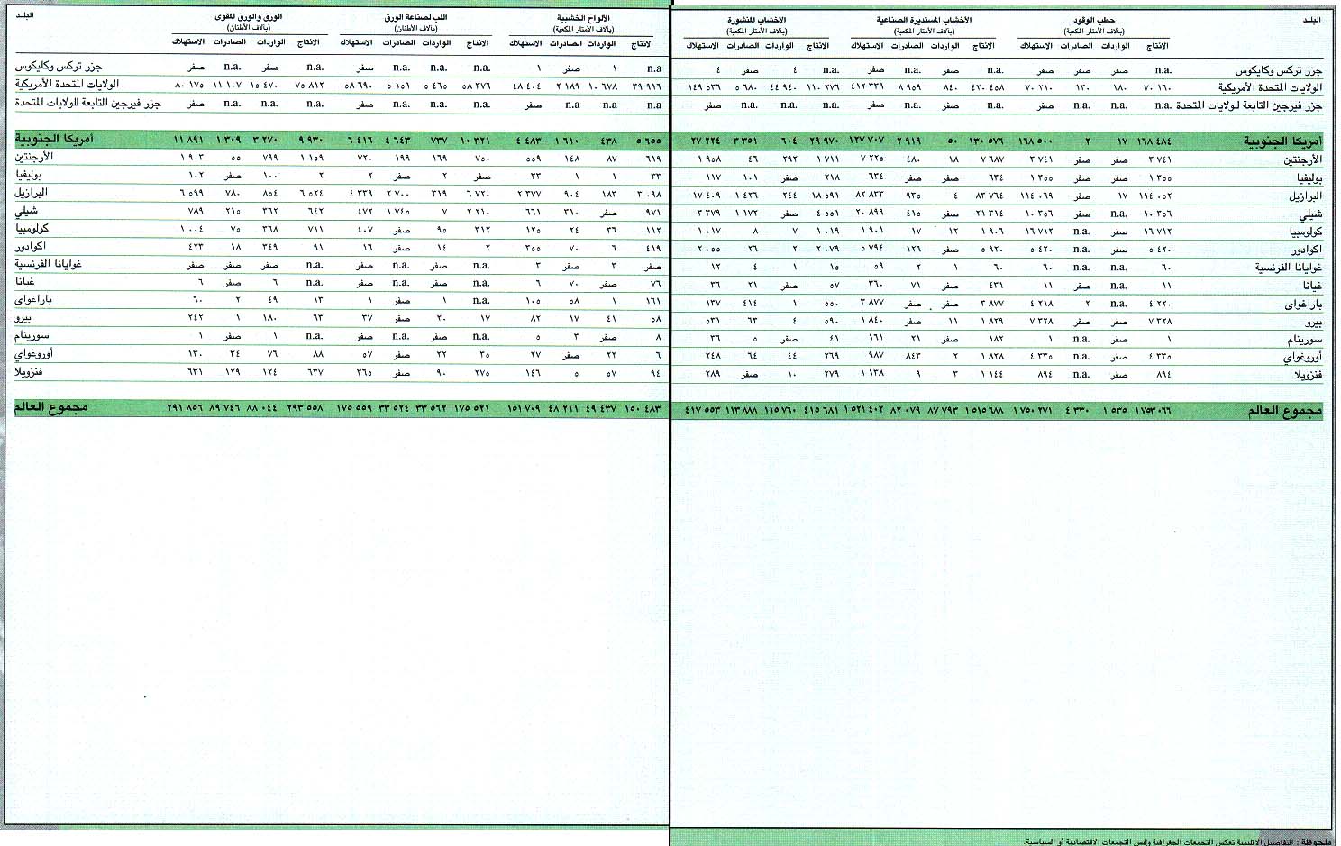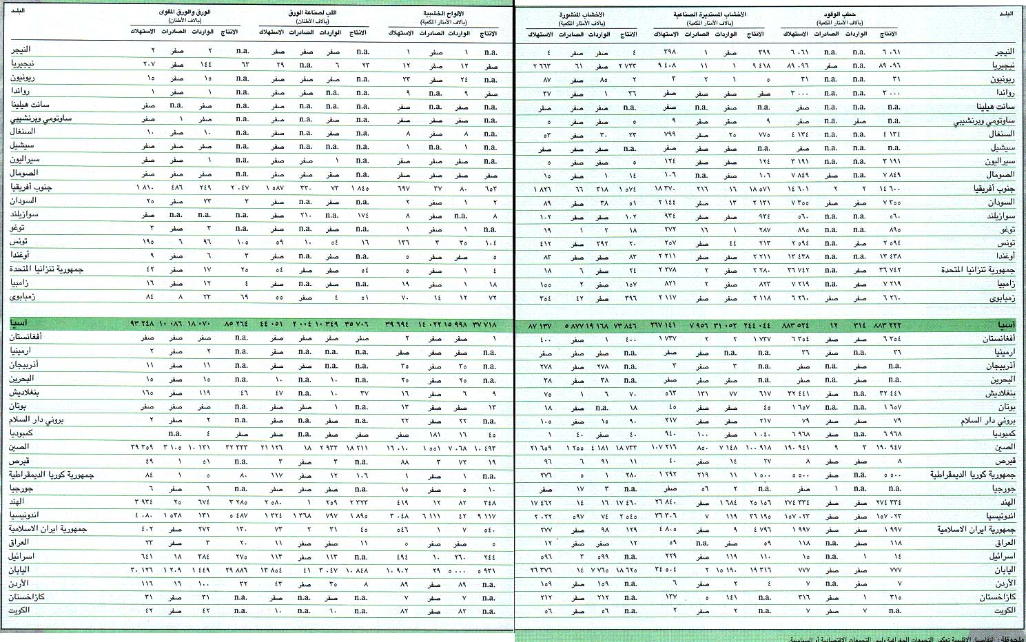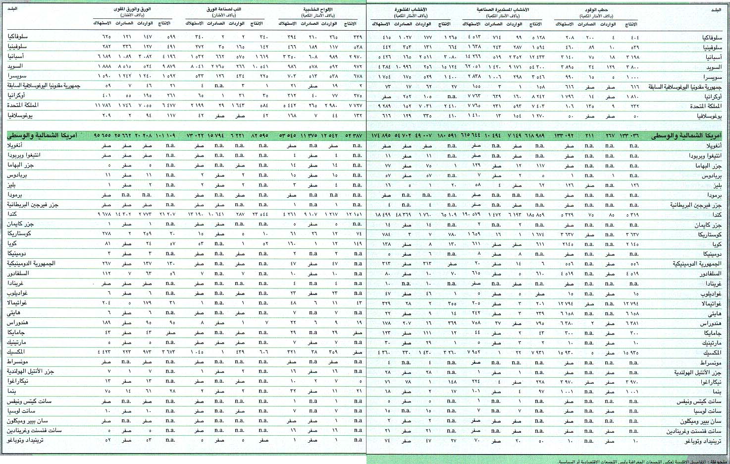 يتضمن الجدول بيانات عن جميع الأقاليم مقسمة إلى بلدان أو مناطق. ومصدر هذه البيانات هو: FAO Yearbook of Forest Products, 1998 (FA0, 2000c) . والمعلومات متاحة أيضا بشكل إلكتروني عن طريق موقع منظمة الأغذية والزراعة على شبكة الإنترنت www.fao.org . ويشير الرقم "صفر" إما إلى صفر حقيقي أو إلى قيمة لا تذكر (أقل من نصف وحدة). وقد تختلف المجاميع الإقليمية عن جملة مجاميع البلدان والمناطق المدرجة في الجدول، ويرجع هذا الاختلاف إما إلى تقريب الأرقام أو إلى أقاليم غير مدرجة في الجداول .