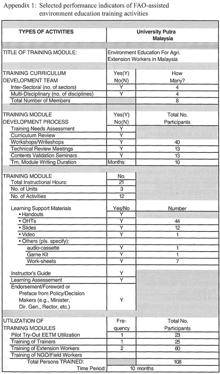 Participants from a total of eight countries obtained first-hand information about EETM development processes and techniques and at the end of the workshop, presented their tentative proposals to develop an EETM of their own with support from FAO. The participants were further asked, upon their return to their own countries, to submit a more detailed project proposal including work-plan and resource requirements for the EETM development activities. For Malaysia, the participants included those representatives of a proposed consortium for the EETM development activity in Malaysia. Subsequent to the workshop, the author communicated with the other consortium members on the intention to work together in this activity. For UPM, the EETM development activity offers an added avenue to the various ways that the university disseminates knowledge and know-how on environment education since the university has been offering a degree programme in environmental science for over two decades. The activity further offers an opportunity for UPM's expertise in agriculture to be made more practical and integrated into the agricultural extension system of the country. In the case of DOA and MADA, they are the largest agricultural development and extension agencies in the country. They conduct training regularly and it is of interest to them to develop new training materials for extension worker and farmers' training. For all members of the consortium, environmental impact assessment is a very important skill to be learned.