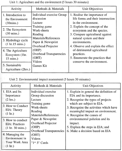 By June 1996, a 153-page EETM entitled An EETM for extension workers in Malaysia which consisted of 21 lessons hours was finally produced. The module was divided into three units. Within each unit were the unit's objectives, instructions, trainee activities, learning methods, audio-visual materials and worksheets to facilitate the learning process.