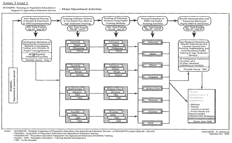 Through this PEDAEXTRA project (INT/92/P95), coordinated and managed by this author until October 1996, 12 institutions in 12 countries (Tanzania, Ghana, Malawi, Kenya, Burkina Faso, Morocco, Nepal, Indonesia, the Philippines, China, Ecuador and Chile) have collaborated since 1994 in integrating population education into agricultural extension and training programmes. The PEDAEXTRA strategy and activities are similar in design to those of the EET described above. The PEDAEXTRA operational process is attached as Annex 3.