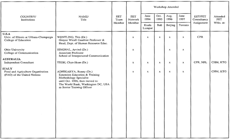 Furthermore, a panel of EET resource persons, highly qualified and experienced in relevant fields such as environment, agriculture extension, education, training and communication, has been established to provide "on-demand" advisory, consultative and trouble-shooting services. They have provided useful ideas and suggestions during EET regional and national workshops and made objective assessments and comments to participating training institutions for improving their EET activities. The list of EET participating institutions and EET key network members as of October 1997 is shown in Annex 2.