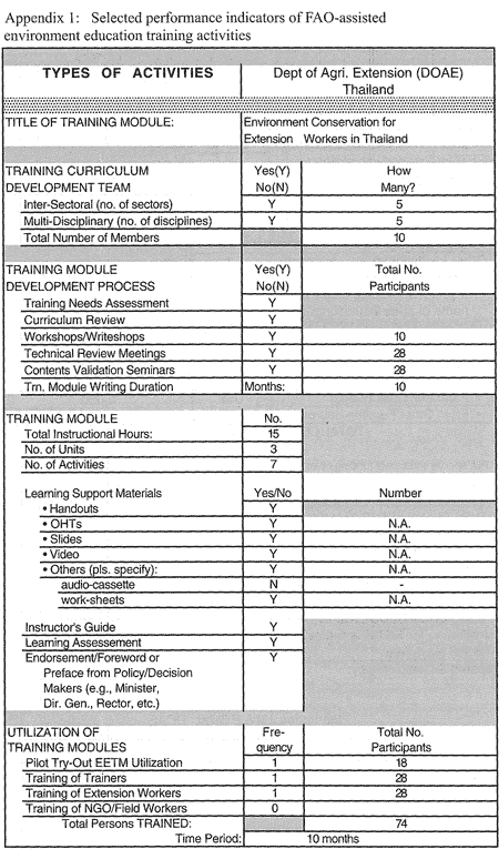 The collaborative efforts of DOAE with FAO to undertake the EETM development activities brought about many positive results and impacts. Most of the staff from the institutions/agencies that were involved are now aware how to solicit knowledge on environmental issues and implement environmental training activities. The DOAE had planned to implement the utilization of EETM for the TOT and other agricultural extension personnel but due to two major problems this activity was delayed. The first constraint concerned the lack of budget (due to a financial crisis in Thailand) for the reproduction and distribution of EETM. Secondly, the CAC for the project was transferred to another agency due to a promotion exercise and the successor did not follow up the activities. These two problems were the main reasons for the delay in the implementation of planned EET activities.