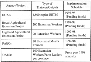 The agencies concerned at the provincial level, especially the offices of agricultural extension and community development, should be able to benefit from EETM if the module is distributed to all the provinces in Thailand. Three key activities were planned for implementation in 1997-1998. The first activity was to reproduce 1 500 copies of the EETM and distribute them to all the provincial and district levels offices (PAEOs and DAEOs) so that they would be able to incorporate EET as a component of all the farmers' training programmes. The second activity was to train at least 20 master trainers at the provincial level and these trainers would in turn train up to 200 extension workers of the Royal agricultural extension projects. The third activity was to train another 90 extension workers of the Highland agricultural extension project using the EETM. The total budget to implement these three activities was estimated at about US$58 600, of which about one third would be solicited from foreign sources.