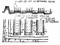 Reduced rice plant population within the ridged-field paddy design caused by the construction of trenches and refuge ponds is one farmer constraint to the practice of rice-fish systems. Farmers can lose as much as 10 percent of their paddy when constructing trenches and refuge ponds for rice-fish systems. To minimize reduced plant population (and potentially decreasing crop yield), plant spacing can be intensified by lessening the recommended distances between hills while maintaining the row spacing (20-25 cm). Normal hill spacing of 15-20 cm between plants can be cut in half, thus doubling the plant population in the side-rows of the trench.
