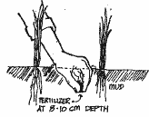 Top-dressing fertilizer is applied at the panicle differentiation stage (about 28-30 days to heading). A shallow layer of standing water in paddy is necessary for fertilizer application, but can increase the possibilities of injuring the fish. However, two alternatives exist which can help minimize these limitations.