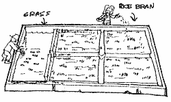 This design was originally developed for swampy areas with the objectives of improving soil properties and increasing rice yield. Later it was, stepwise, integrated with azolla and fish. Rice is planted on the ridge, azolla as a feed for fish as well as a biofertilizer, and green manure and fish are stocked in the trenches.
