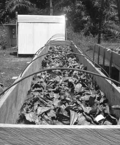 Feuilles d'Ancistrocladus korupensis séchant au soleil dans le parc national de Korup (Cameroun); ces feuilles seront envoyées à l'Institut national de recherche sur le cancer des États-Unis et entreront dans la préparation de médicaments