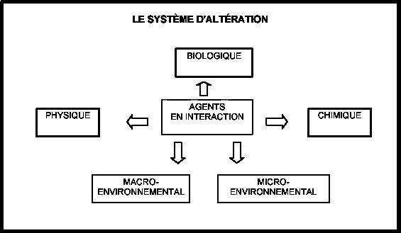 La détérioration biologique est le résultat net des interactions entre de nombreux agents daltération que lon peut grosso modo classer dans les catégories biologique, chimique, physique, macroenvironnementale et microenvironnementale (figure 2). Toutefois, les effets relatifs de ces agents dépendent souvent dans une large mesure de la nature et du degré de lintervention humaine.