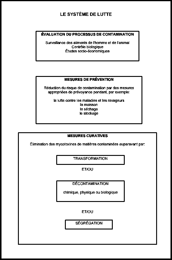 Le système de contrôle (figure 6) présente, à titre dexemple, quelques interventions (mesures) préventives et curatives qui peuvent être employées pour lutter contre les mycotoxines lorsque la nature de la contamination a été correctement évaluée.