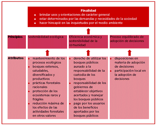 En la Figura 3.1 se indican los elementos de un marco general de política forestal y la jerarquía de las finalidades, principios y prioridades para la acción.