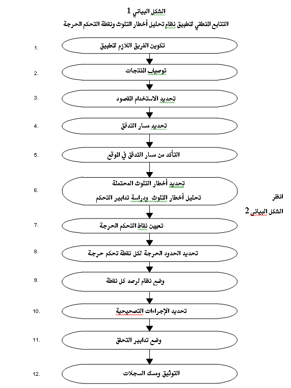 يقوم تطبيق مبادئ نظام تحليل أخطار التلوث ونقطة التحكم الحرجة على المهام التالية التي يحددها التتابع المنطقي لتطبيق هذا النظام (الشكل البياني 1)